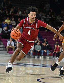 While he played both guard positions in high school, functioning especially well as a catch-and-shoot threat, the Penn staff has him working on the ball behind sophomore AJ Levine, a role that’s especially valuable at the moment with senior guard Dylan Williams sidelined due to injury.