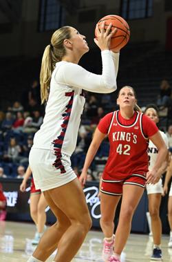 When Njike wasn’t on the court, Kelley had her own quality run at the ‘5’ spot. The 6-1 post from San Francisco was on the court for 10 minutes against King’s and contributed nine points and three rebounds along with a couple other assorted stats, knocking down all four of her shots including a 3-pointer from straightaway.