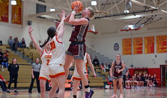 Only three Haverford players got into the scoring column: sophomore guard Grace Maloney was outstanding with 21 points on 9-of-12 shooting; senior forward Maura Gilroy toughed her way to 12 points, and sophomore Taylor Gleason added six.